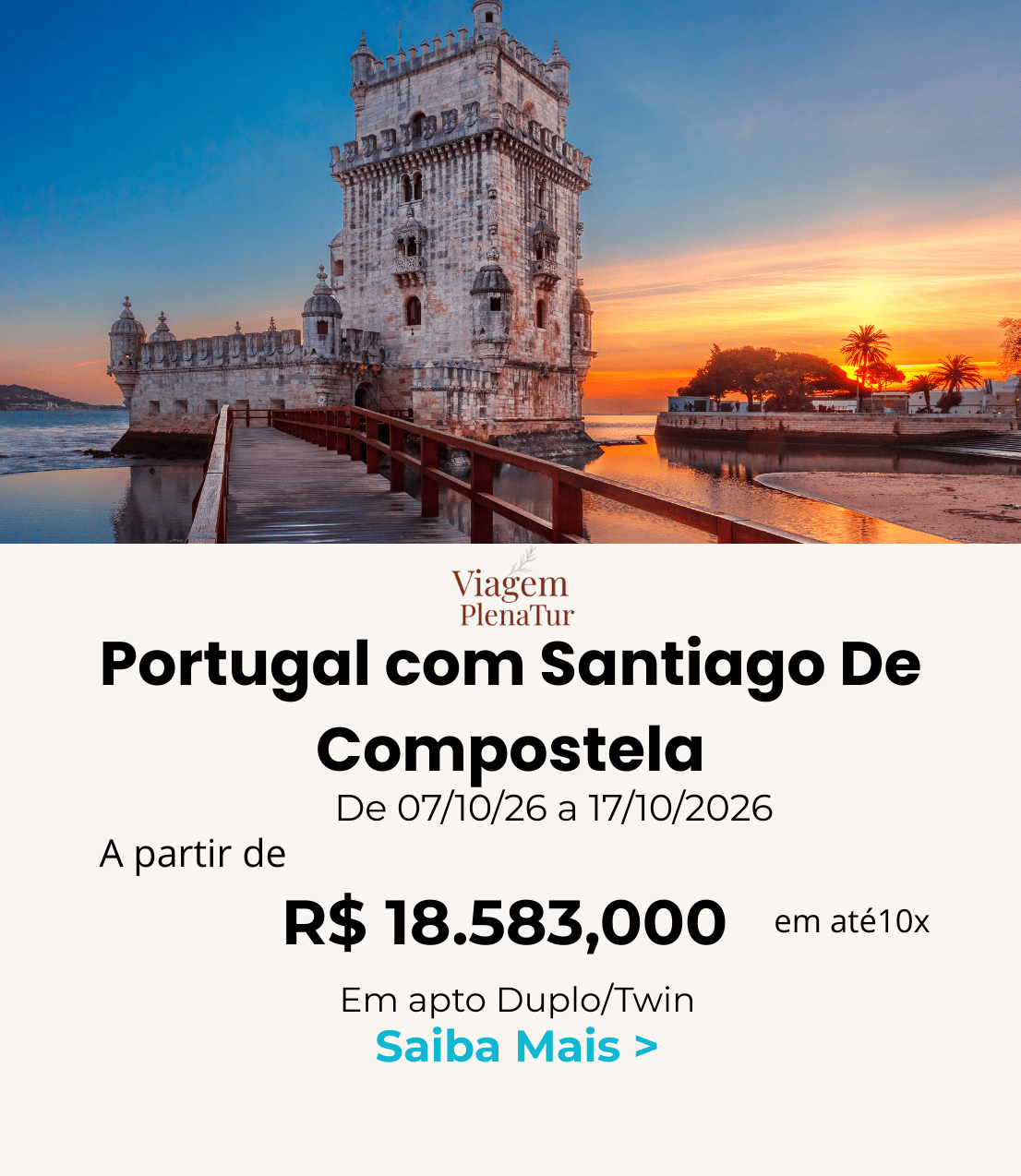 Lisboa, Sintra, Cascais, Estoril, Óbidos, Nazaré, Coimbra, Braga, Santiago de Compostela, Viana do Castelo, Guimarães, Porto, Aveiro, Fátima Grupo Especial Viagem Plena Tur – De 07/10 a 28/05/2026