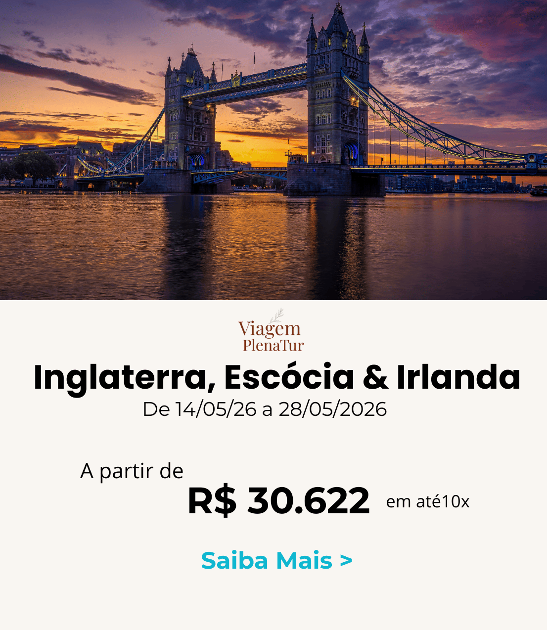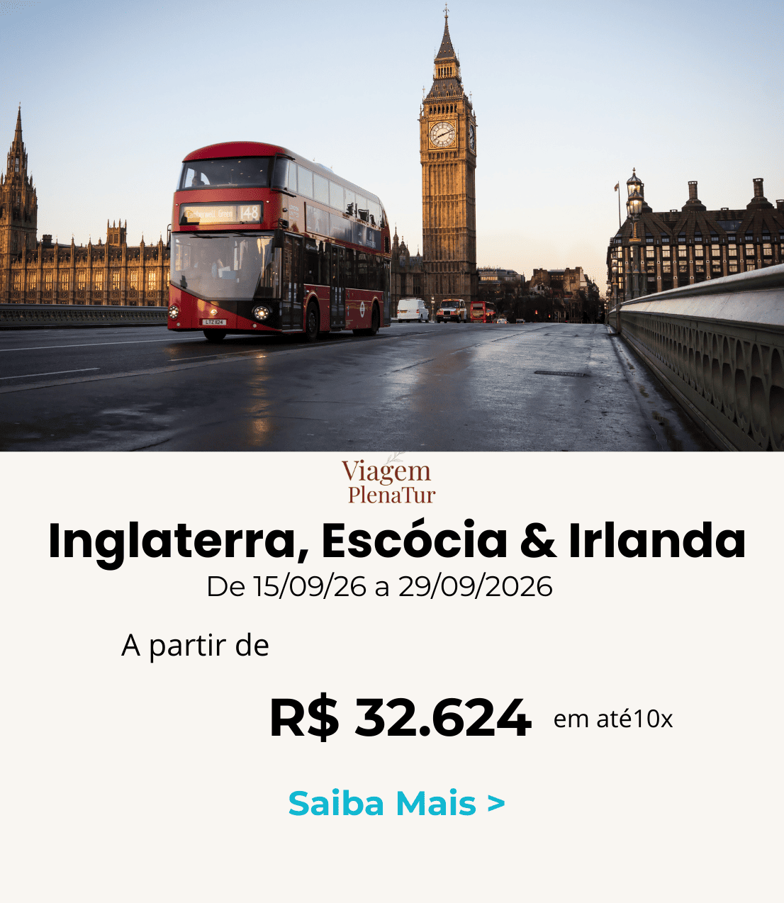 Londres, Durham, Edimburgo, Inverness, Glasgow, Dublin e Liverpool Grupo Especial Viagem Plena Tur – De 15/09 a 29/09/2026